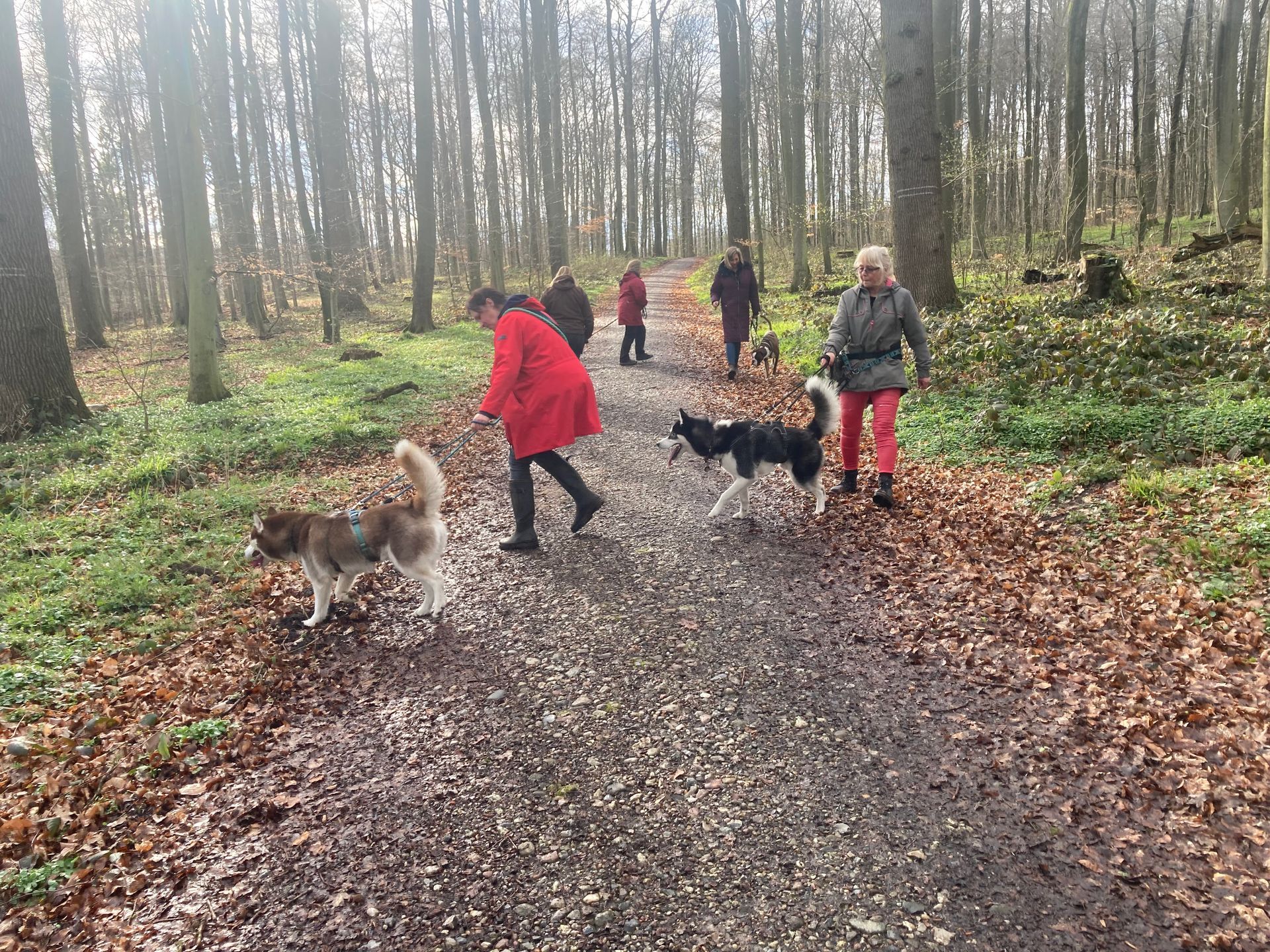 Während wir mit den Hunden laufen, baue ich (je nach Gruppen-Dynamik) mal mehr und auch mal weniger kleine Übungen für Eure Hundebegegnungen mit verschiedenen Laufmuster ein. Hier ist der Stresslevel ausschlaggebend, wieviel davon sinnvoll ist. Markersignal und Belohnung, Umorientierungssignale und ggf. auch Verhaltensunterbrecher sowie Ruheübungen kommen zum Einsatz.