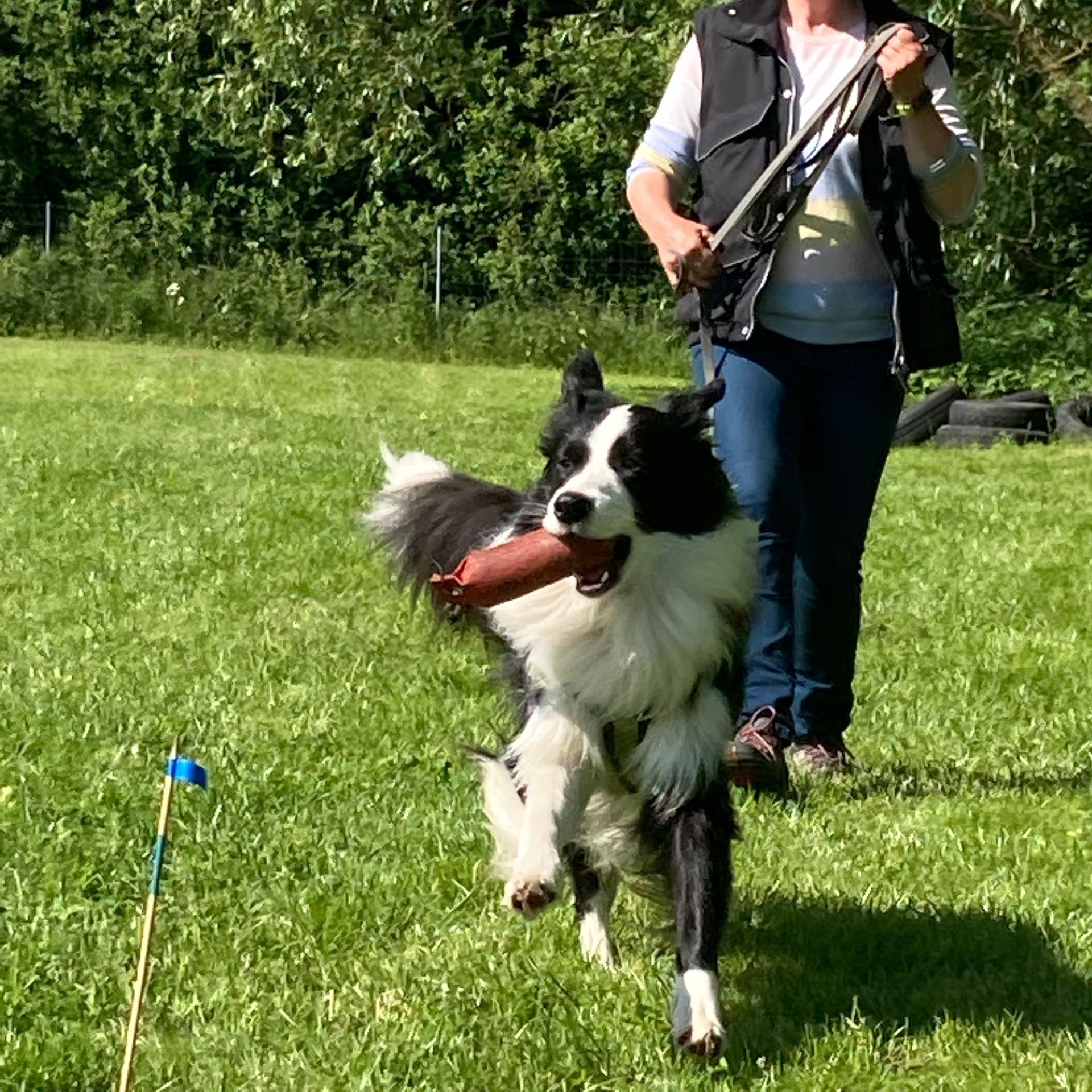 Auf der Suche nach dem Dummy arbeitet er mit der Nase und/oder den Augen um sich zu orientieren. Mit abwechlungsreichen Übungen fordern und fördern wir zusätzlich seine Impulskontrolle, zu der im gewissen Maße auch immer das Erlernen von Frustrationstoleranz gehört. Zudem verbessert sich hier spielerisch die Zusammenarbeit zwischen Hund und Mensch. So entsteht ein sinnvolles Spiel mit dem Dummy, welches nicht nur dem Hund große Freude bereitet.